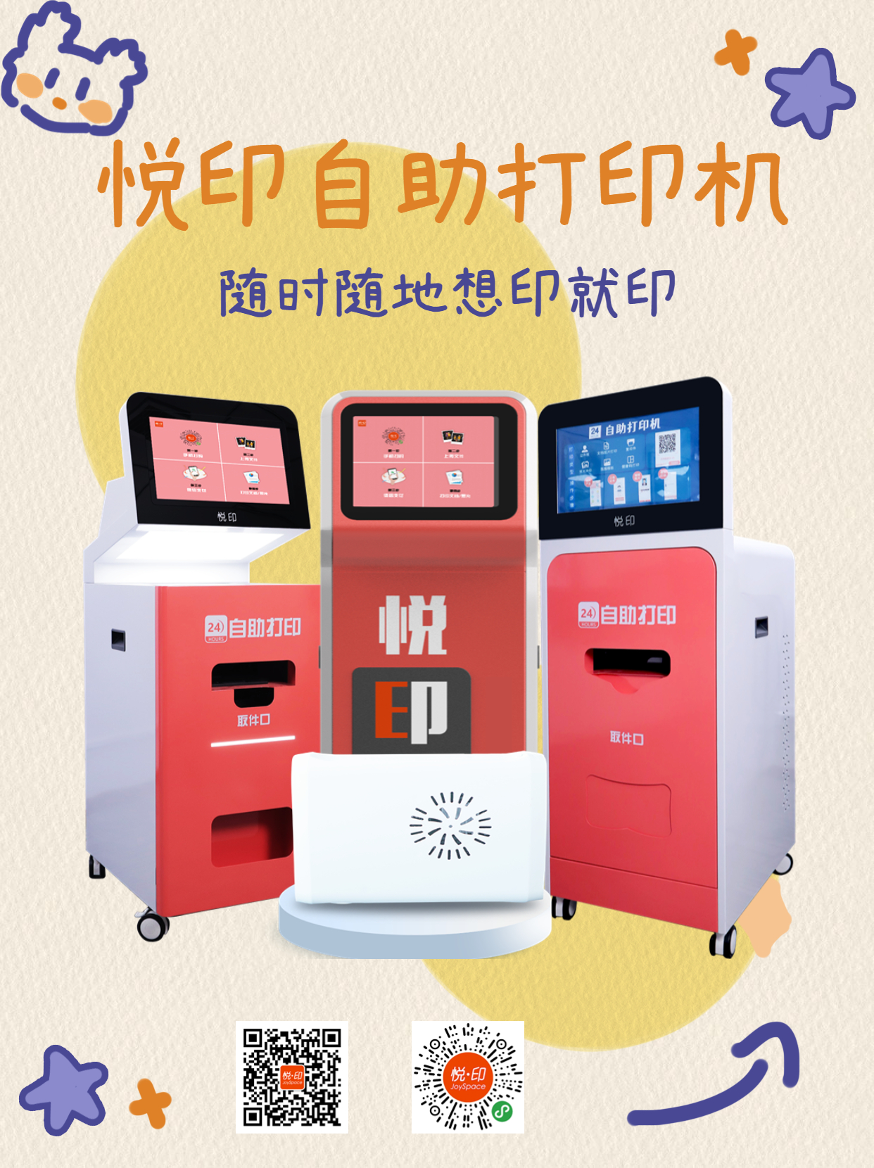 悦印畅享版功能与悦印青春版一致,但不配置轮播屏,价格也有所降低,更适合配置在地铁站、政务大厅、文具店、打印店中的多台设备、街边打印等场景中使用。